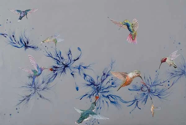 “In my practice, I bring forth the life force of a living form by abstracting and transforming its elements. A delicate flower may explode like a bomb, or become a planet in a galaxy. A massive golden butterfly flock departs from a dark landscape, and colorful hummingbirds escape from an apocalyptic explosion. At times ephemeral and celestial, at others haunting, I explore energetic contrasts and mystical symbolisms in my work.”