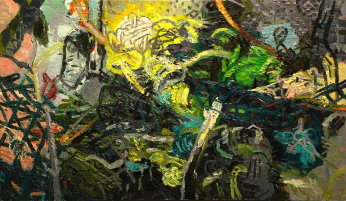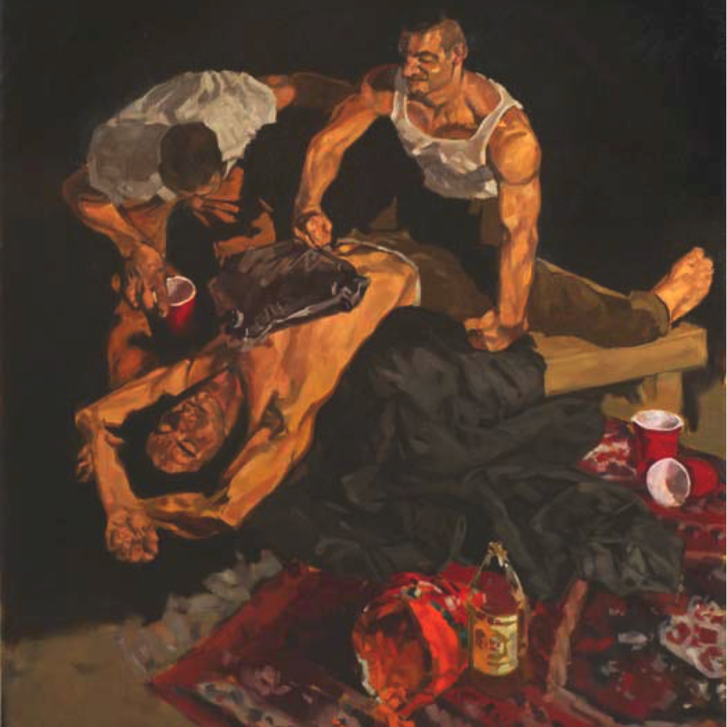 “My work often references Renaissance and Baroque painting giving these figures a sacred yet often satirical quality. Additionally these references enlarge the narrative, providing an existential quality through poses taken from depositions, pietas, and other Christ or martyrdom paintings, while simultaneously criticizing the ritualistic construction of masculinity. Conversely the paintings referencing the harem paintings of Ingres and Gerome highlight the conflict of homoeroticism in a homophobic culture. The settings, often party scenes, critique the archaic traditions and rituals of the epoch, which so forcefully shape these individuals. Additional reference and metaphor are provided through, pattern and object. The use of many layers of subtlety allows me to create a piece of work that is constantly growing with the viewer.”
