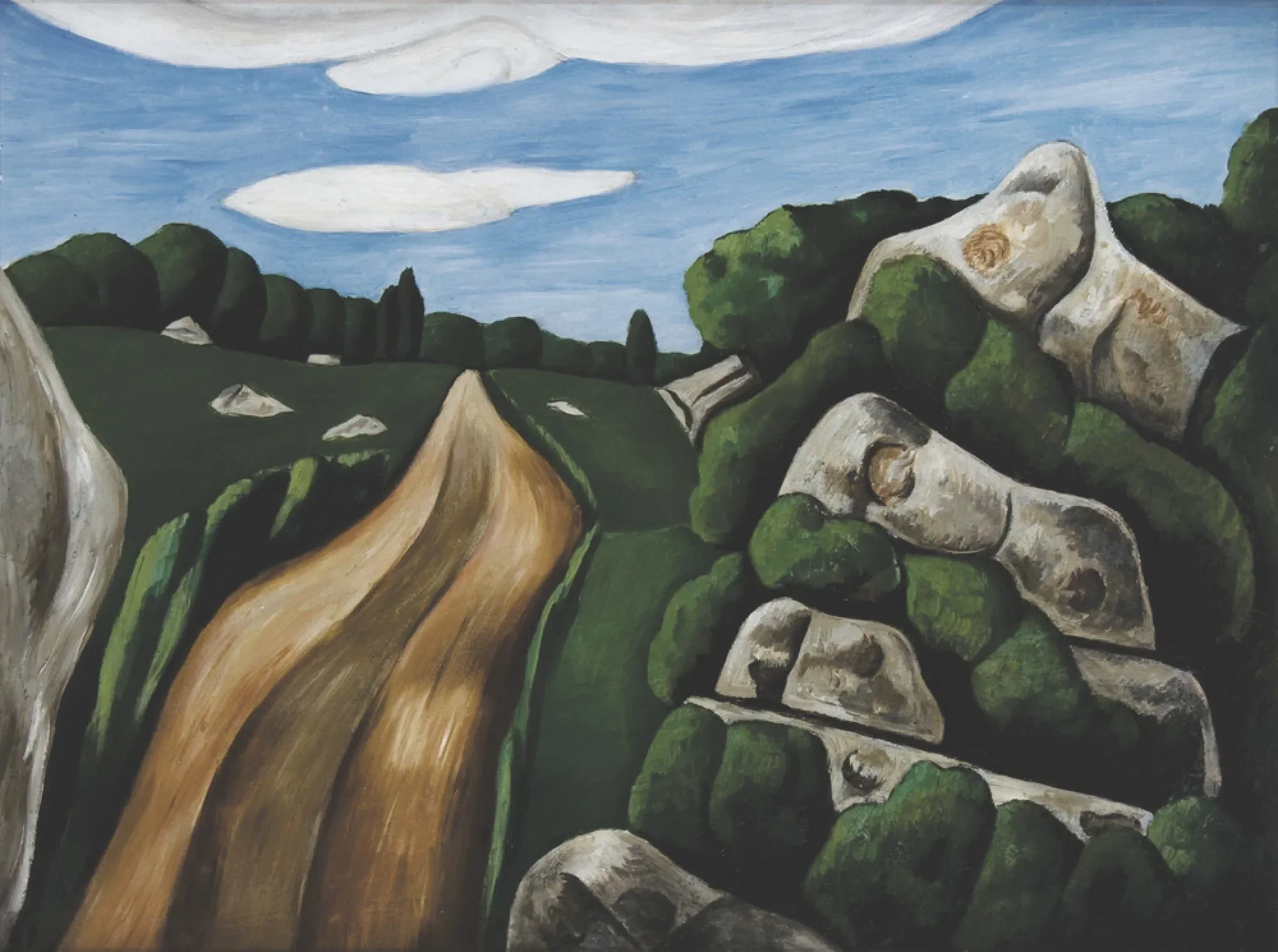 Hartley’s place in the annals of American art history — as a member of noted New York dealer Alfred Steiglitz’ circle of artists — was secure on the strength of the boldly colorful paintings of American Indian and German military subjects done in Paris and Berlin between 1911 and 1916. However, the Dogtown landscape, which he returned to paint in 1934 (again staying with the Wilkenses), and again from memory in 1935 and 36, proved the catalyst and stepping-off point for Hartley’s last great creative period. These bold landscapes and genre paintings, celebrating his native New England and its northern coast and people, would rival in power his German paintings of twenty-five years before and ensure his reputation as one of the greats of American Modernism.
