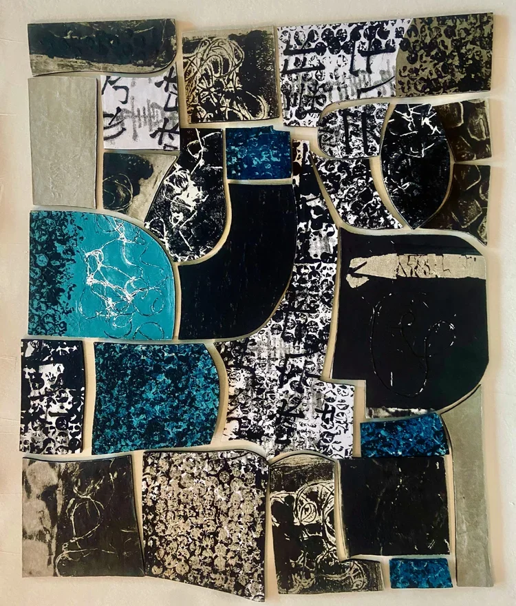 Painter and mixed-media artist Terry Del Percio-Piemonte is showing work from two completely different series. Her current paintings arrange complex patterns and shapes suggesting aerial views of cityscapes that abstractly reflect how we construct our communities from both a physical and political standpoint. On her other series, Del Percio remarks, “The year 2020 seemed to bring the world’s insanity to a volcanic head, and it has had a tremendous impact on me personally.” Using fabric and threads for a new collage series called “Frayed Around the Edges” Del Percio appears to be documenting her emotional reactions to the very disturbing times in which we live.